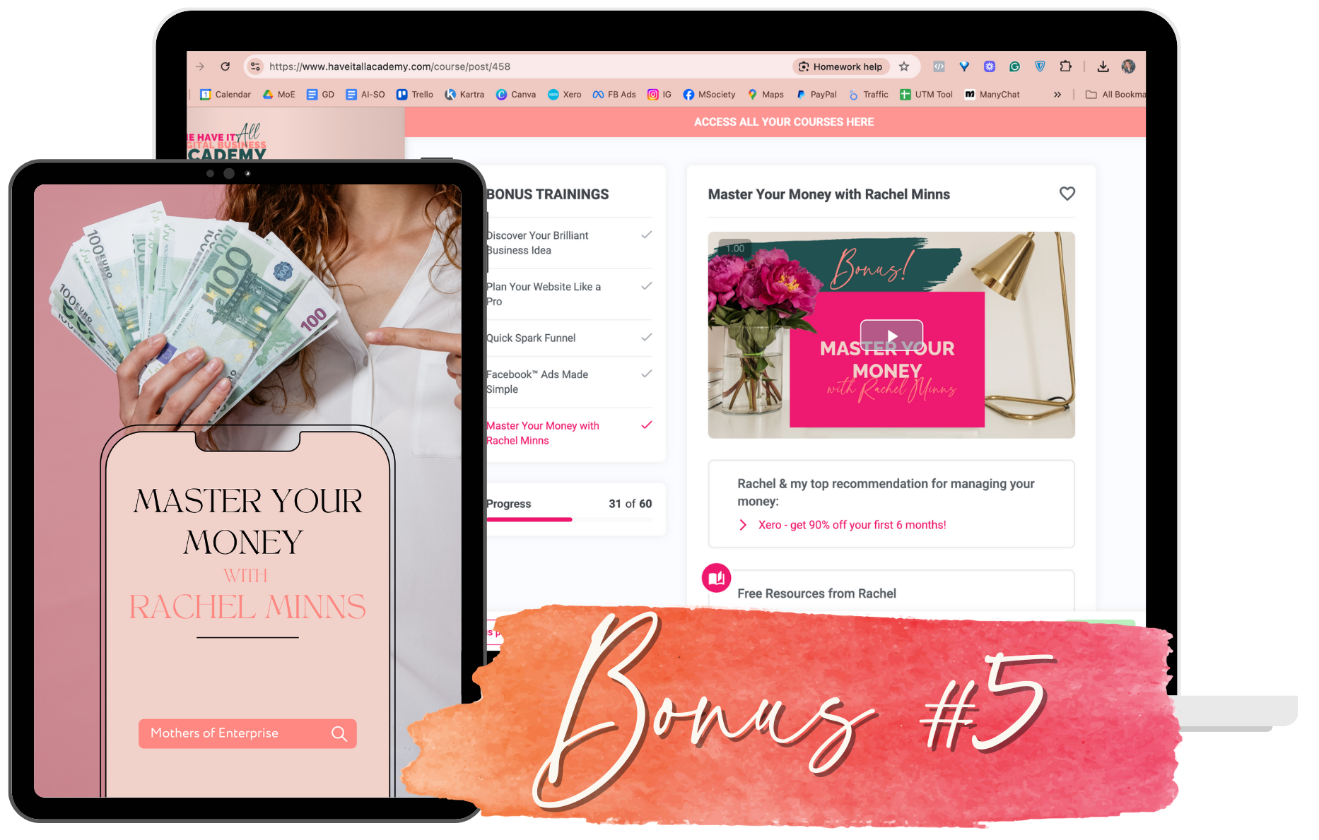 Say goodbye to financial confusion! In this empowering bonus training, money coach and certified bookkeeper Rachel Minns shows you how to manage your business finances like a CEO, even if numbers aren’t your thing.